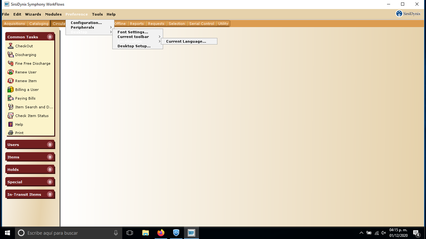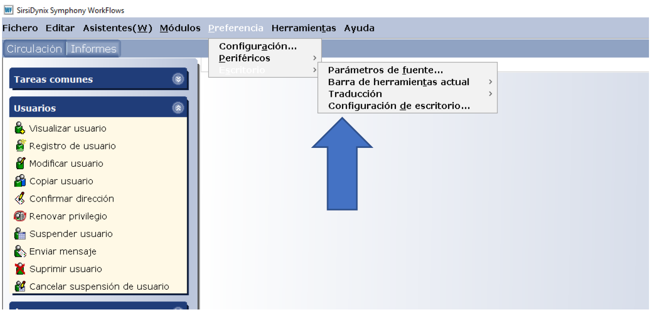 - El siguiente paso será configurar el formato de hora, fecha y visualización. Para esto vaya al menú superior “Preferencia/Escritorio/Configuración de Escritorio”